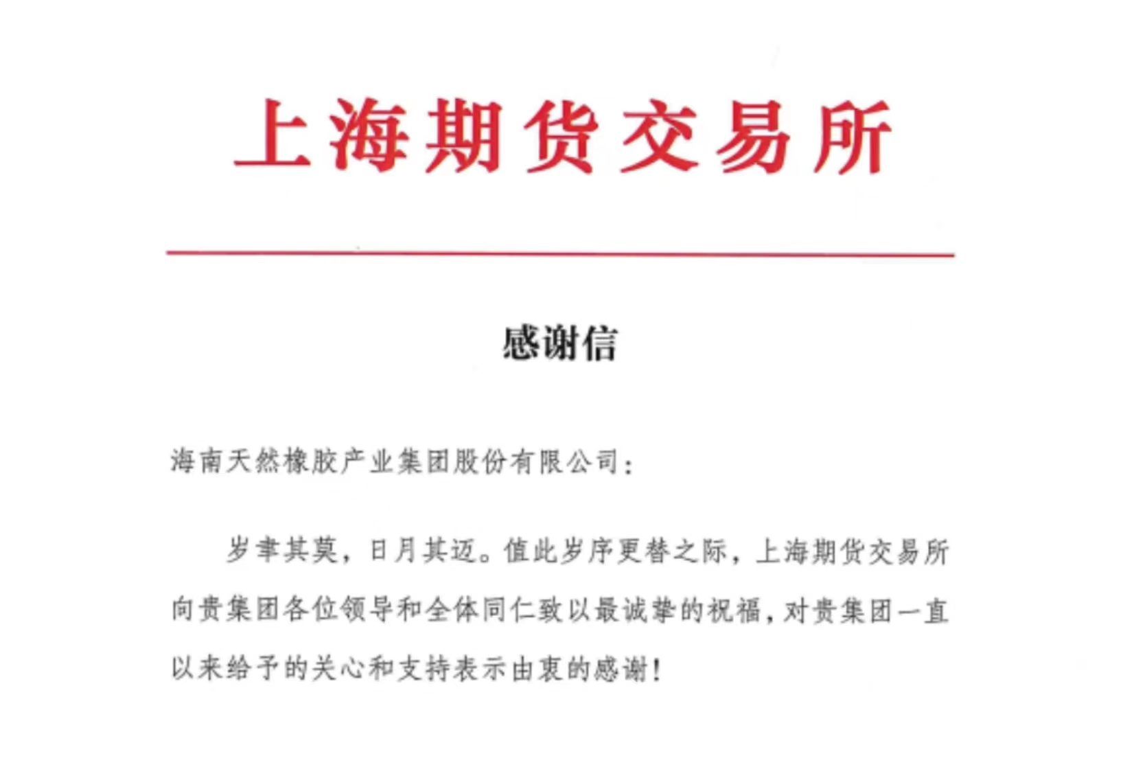 海南橡膠收到上海期貨交易所感謝信